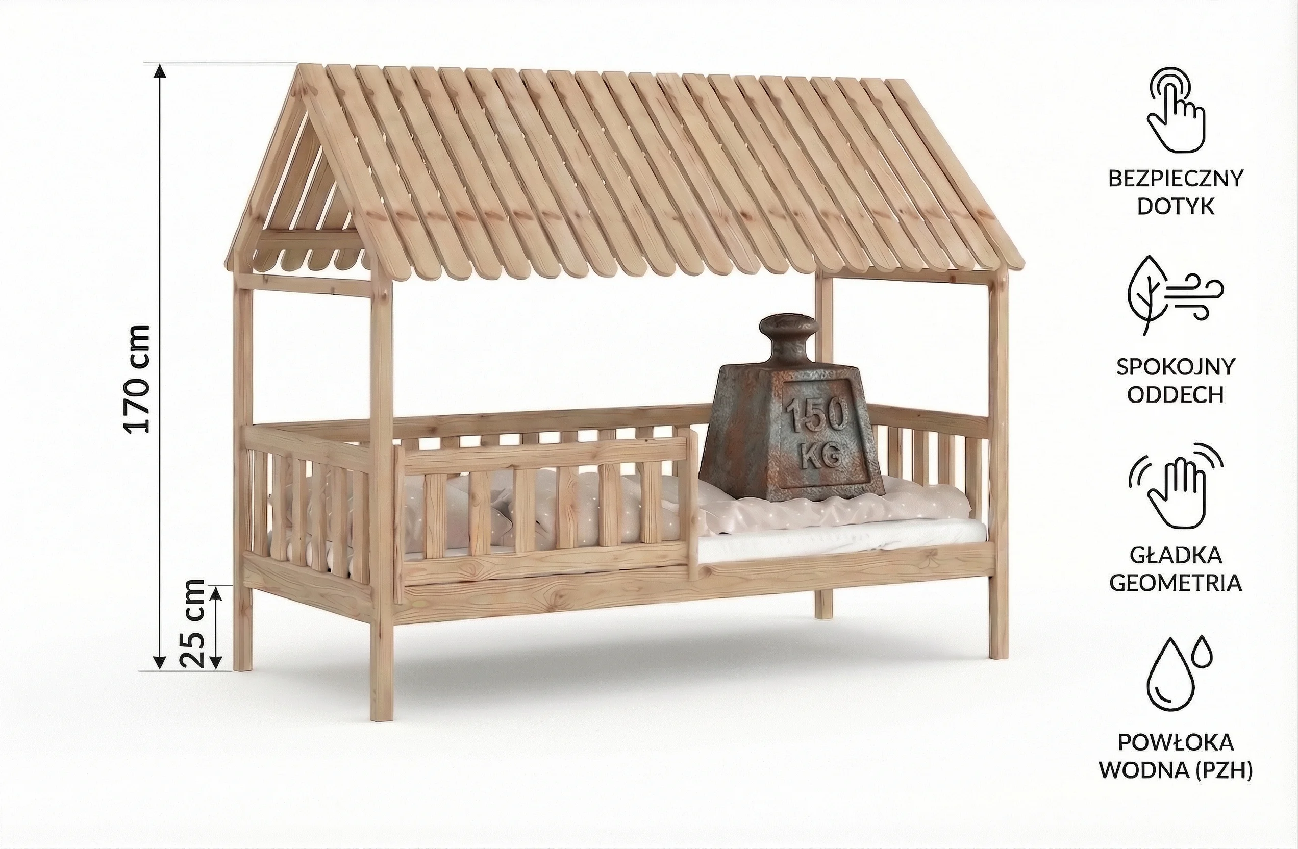 Zwykłe cienkie listewki pękają i stresują? U nas tego nie ma! Nie pozwolimy, by łóżko dla dziecka było niepewne. Dajemy potężną, grubą sosnową dechę. Skaczcie, bawcie się i śpijcie spokojnie – nasza konstrukcja udźwignie bez problemu aż 150 kg.