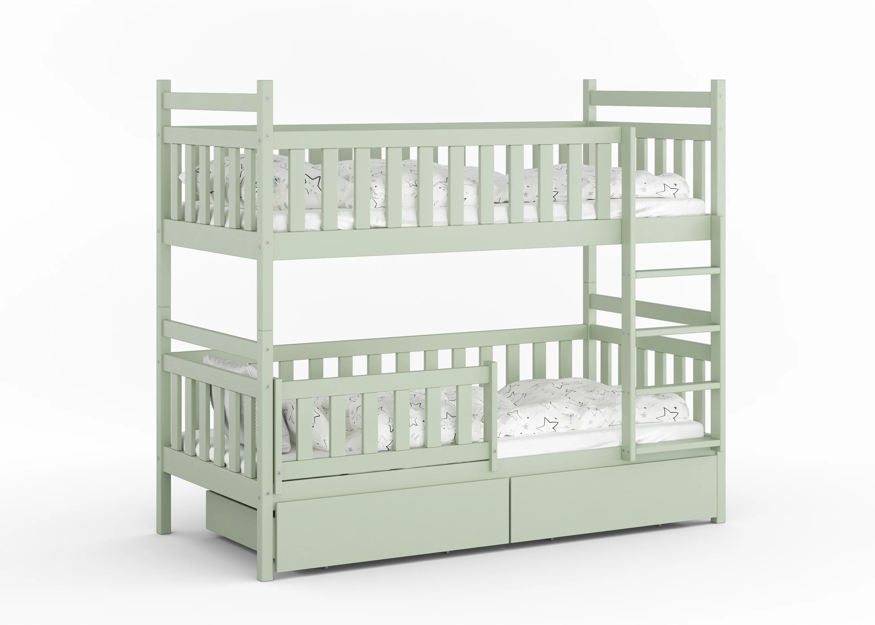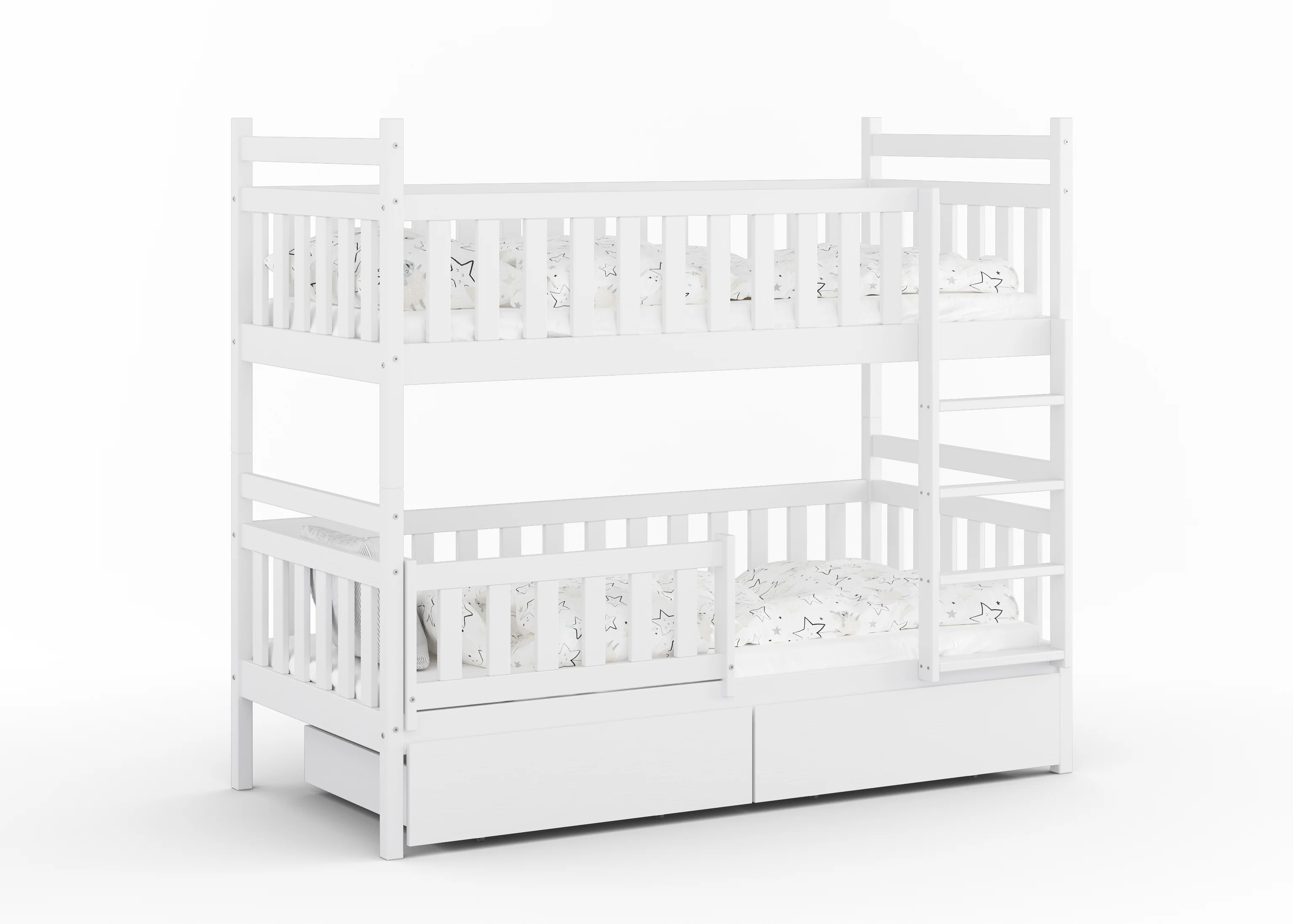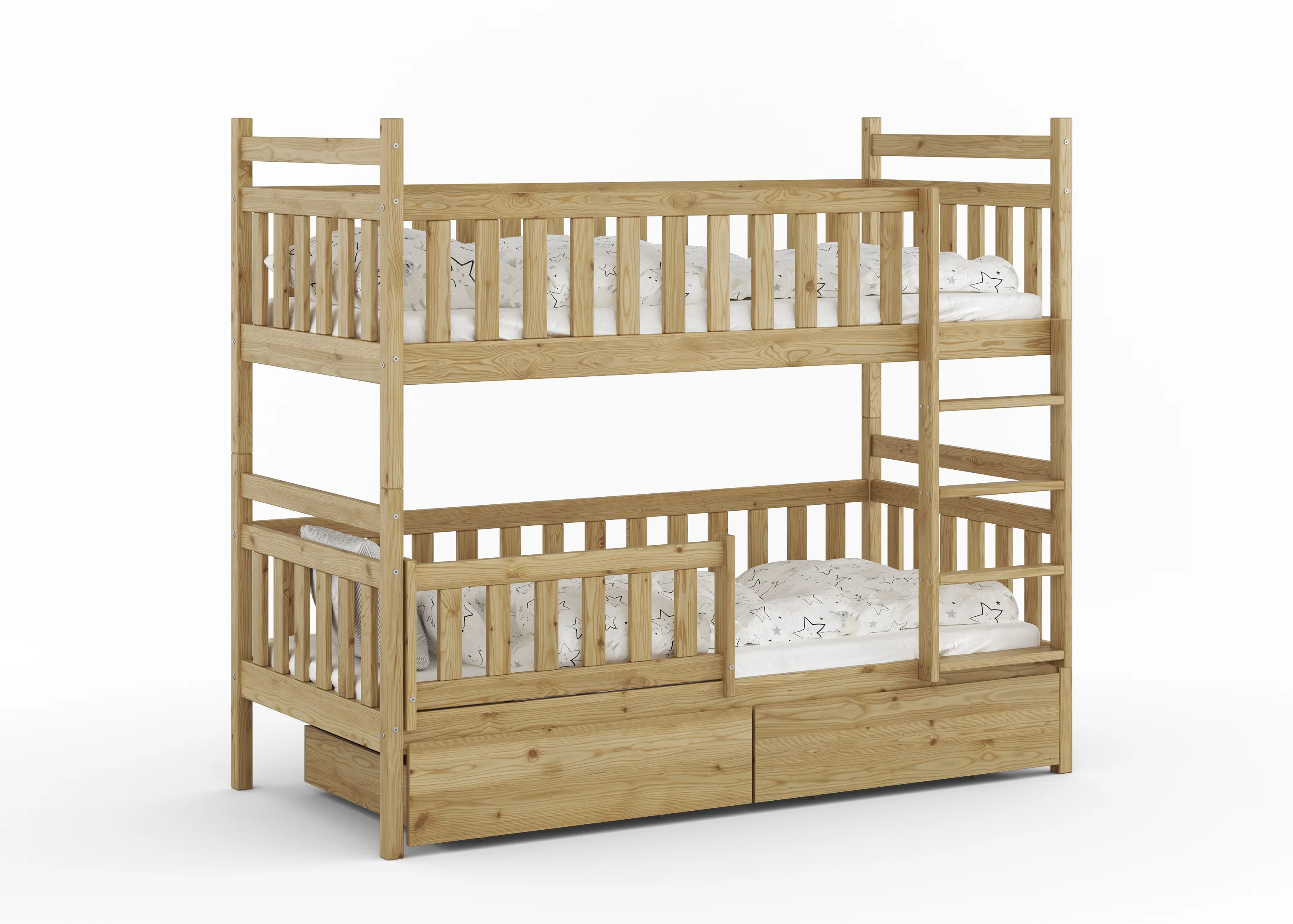 Konstrukcja o niesamowitej wytrzymałości. Każdy poziom wytrzyma aż 150 kg, więc spokojnie możesz położyć się przy dziecku i poczytać bajkę. Zastosowaliśmy solidny stelaż z grubych desek 21 mm (standardowe listwy flex to tylko 8 mm!), dzięki czemu dzieci mogą bawić się na łóżku bez żadnych obaw.